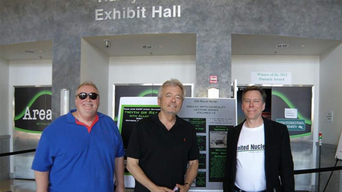 George Knapp shares a number of items and articles including a photo at the Area 51 Exhibit at the Atomic Testing Museum, with Bob Lazar on the right, George in the middle, and Gene Huff on the left.